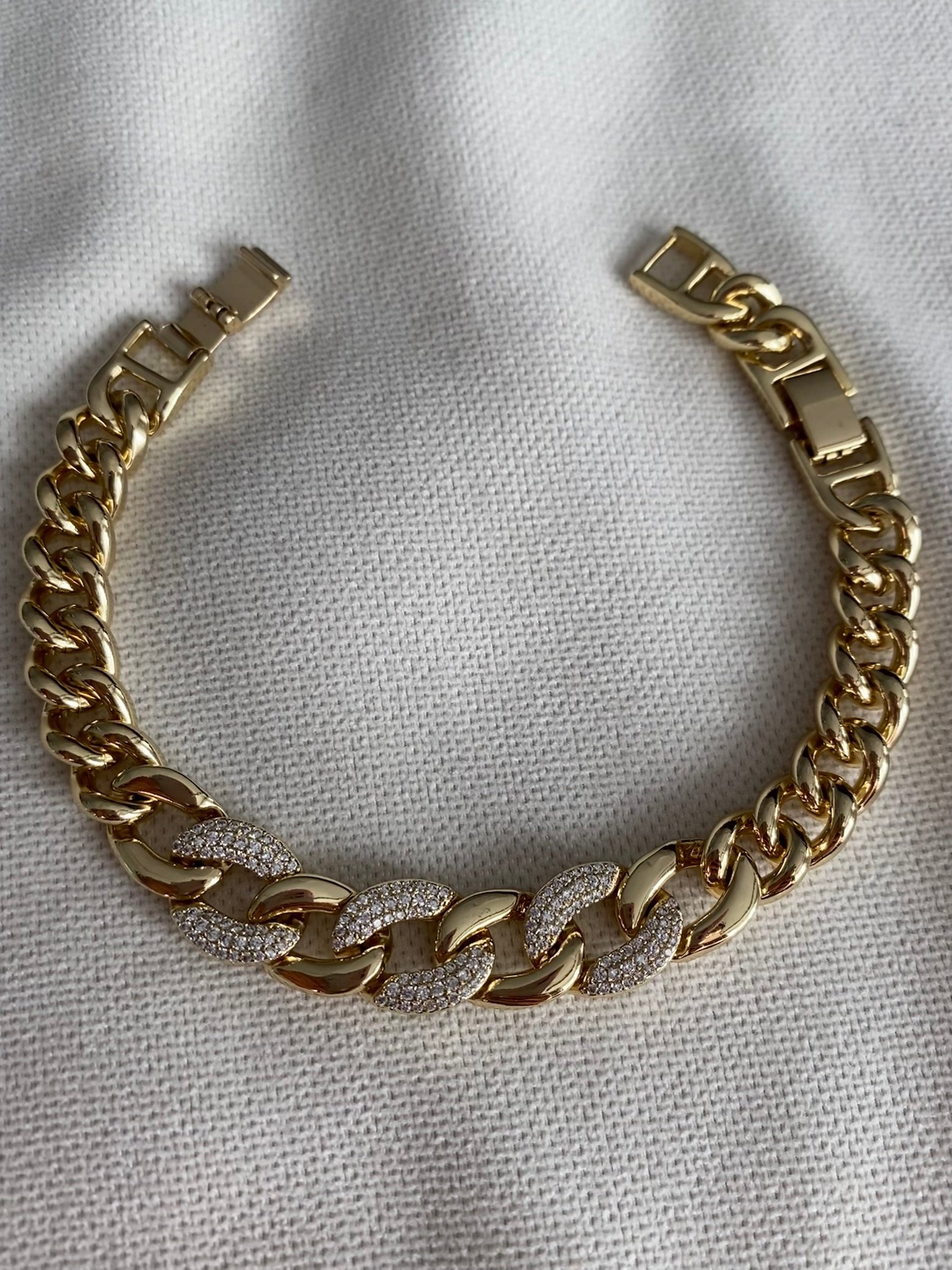 Taş detaylı gurmet bileklik, klasik gurmet zincir tasarımını ışıltılı taşlarla buluşturarak şık bir görünüm sunar. Hem günlük hem özel günlerde stilinizi tamamlayan zarif bir aksesuardır. Dayanıklı yapısıyla uzun süre parlaklığını korur ve dikkat çekici bir şıklık sağlar.