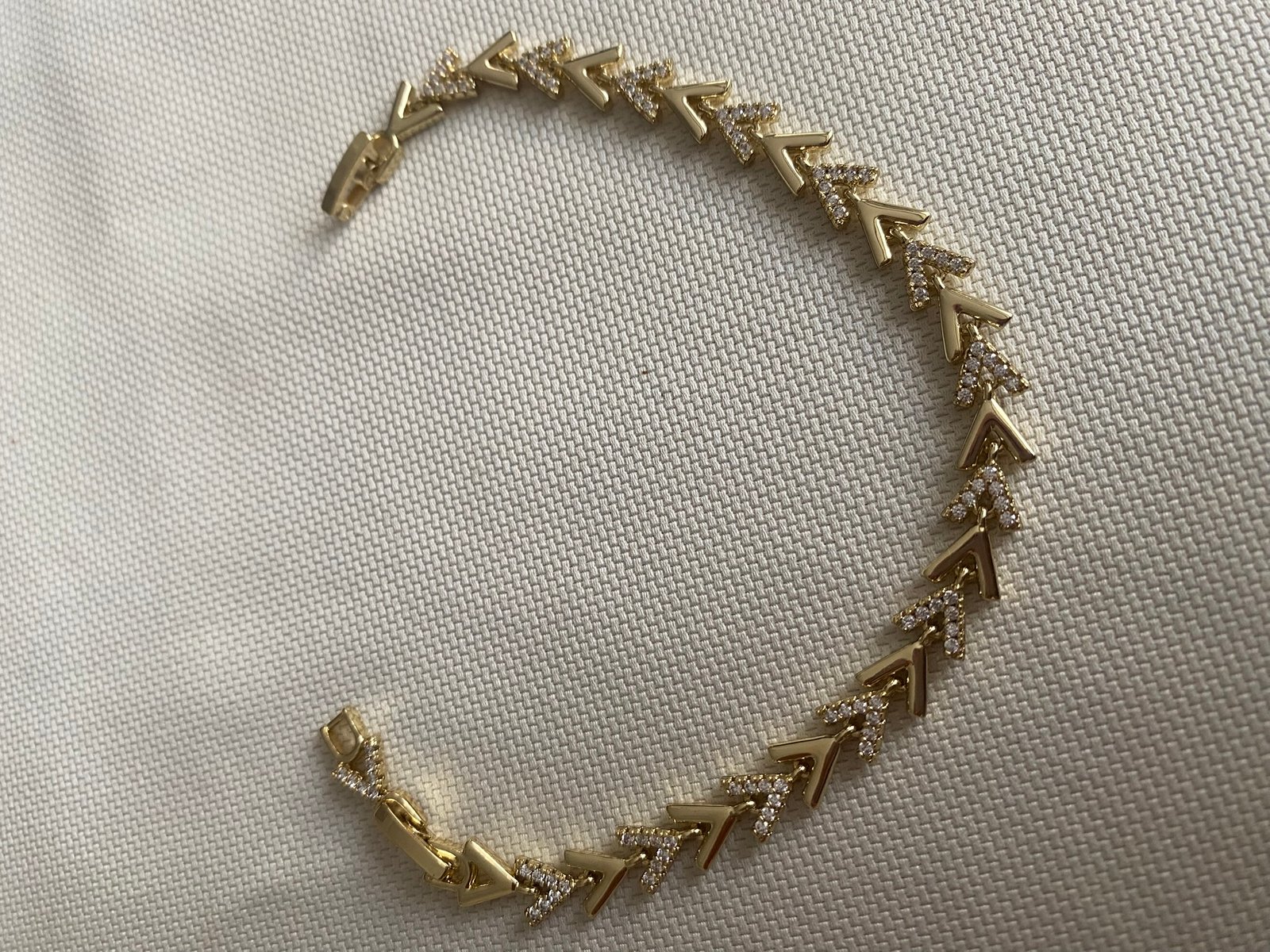 Kılçık model ve V formundaki tasarımıyla bu bileklik, modern ve özgün bir şıklık sunar. İnce detayları ve parlak kaplaması sayesinde her kombine zarif bir dokunuş katar. Günlük ve özel günlerde stilinizi tamamlayan şık bir aksesuardır.